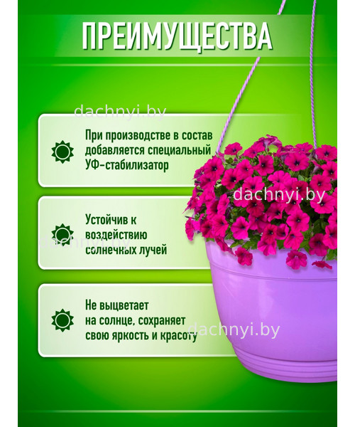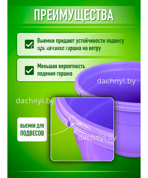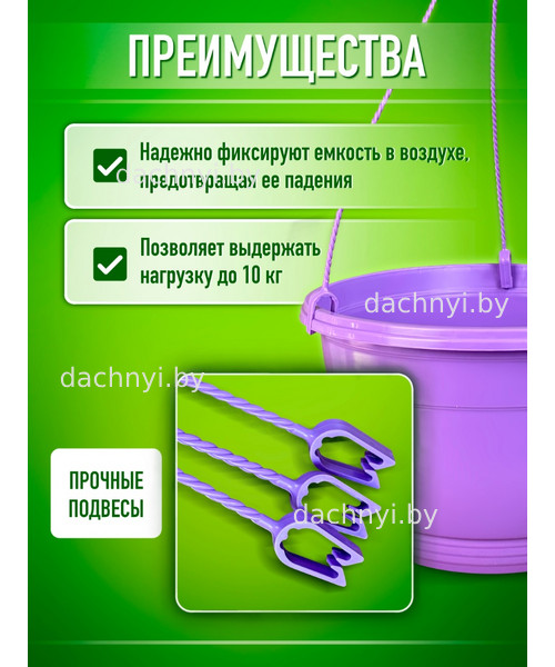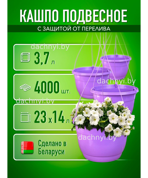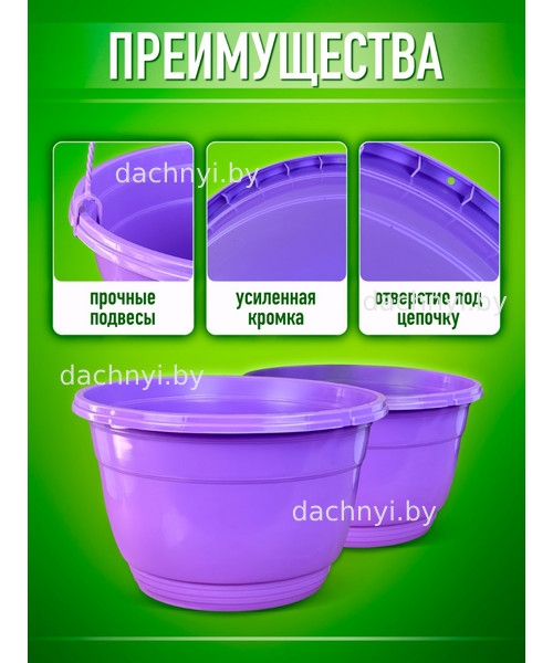Подвесное кашпо литое для цветов предназначено для размещения декоративных растений для дома, улицы, балкона, веранды. Интерьерный горшок для орхидей и фиалок подвешивается на трех держателях, объединенных удобным крючком. Поставляется в картонной коробке, что минимизирует повреждения. Отличный подарок любимой или маме, бабушке и тете, сестре и всем любителям домашней микрозелени и озеленения в целом. Набор кашпо объемом 3,7 л. Горшки для цветов выполнены в различных цветах, благодаря чему вы всегда сможете подобрать необходимый оттенок для Вас. Горшок для цветов изготовлен из высококачественного, надежного и крепкого пластика, который абсолютно безопасен для использования. Данная модель горшка идет в комплекте с подвесом. На дне кашпо для растений 3 л предусмотрены дренажные отверстие, которое сохраняет небольшое количество воды в горшке для поддержания оптимальной влажности. Наш цветочный горшок подойдет для петуний, фиалок и других цветов. При необходимости, можно легко снять подвес, и использовать как напольное кашпо, декоративное кашпо или вазон. Вазоны на лоджию, балкон, цветы, вазы и кашпо для загородного дома станет отличным подарком на 8 марта новоселье для любимых или просто так порадовать себя.
