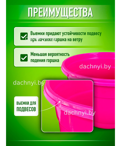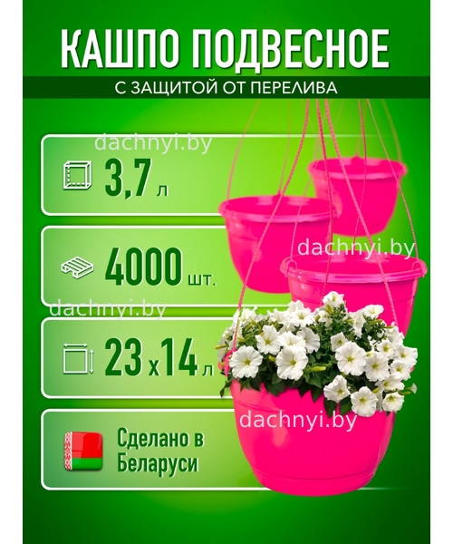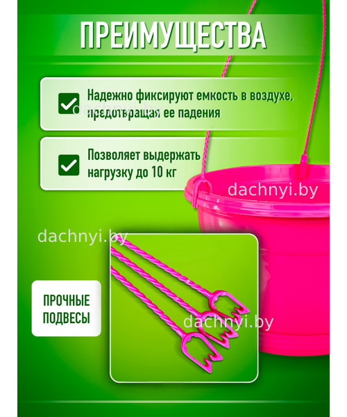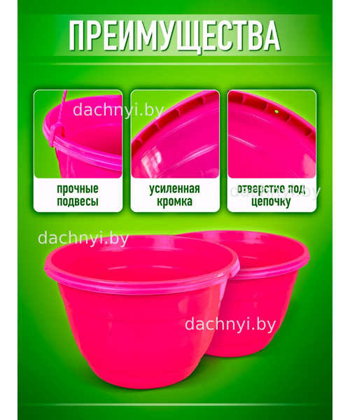 Подвесное кашпо литое для цветов предназначено для размещения декоративных растений для дома, улицы, балкона, веранды. Интерьерный горшок для орхидей и фиалок подвешивается на трех держателях, объединенных удобным крючком. Поставляется в картонной коробке, что минимизирует повреждения. Отличный подарок любимой или маме, бабушке и тете, сестре и всем любителям домашней микрозелени и озеленения в целом. Набор кашпо объемом 3,7 л. Горшки для цветов выполнены в различных цветах, благодаря чему вы всегда сможете подобрать необходимый оттенок для Вас. Горшок для цветов изготовлен из высококачественного, надежного и крепкого пластика, который абсолютно безопасен для использования. Данная модель горшка идет в комплекте с подвесом. На дне кашпо для растений 3 л предусмотрены дренажные отверстие, которое сохраняет небольшое количество воды в горшке для поддержания оптимальной влажности. Наш цветочный горшок подойдет для петуний, фиалок и других цветов. При необходимости, можно легко снять подвес, и использовать как напольное кашпо, декоративное кашпо или вазон. Вазоны на лоджию, балкон, цветы, вазы и кашпо для загородного дома станет отличным подарком на 8 марта новоселье для любимых или просто так порадовать себя.