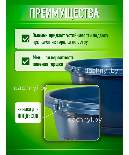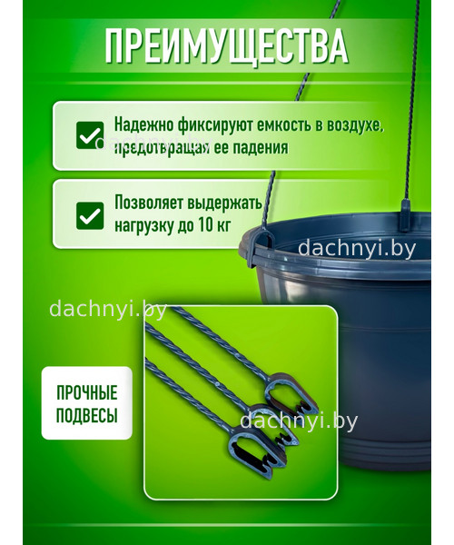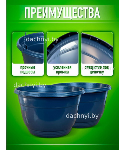 Подвесное кашпо литое для цветов предназначено для размещения декоративных растений для дома, улицы, балкона, веранды. Интерьерный горшок для орхидей и фиалок подвешивается на трех держателях, объединенных удобным крючком. Поставляется в картонной коробке, что минимизирует повреждения. Отличный подарок любимой или маме, бабушке и тете, сестре и всем любителям домашней микрозелени и озеленения в целом. Набор кашпо объемом 5 л. Горшки для цветов выполнены в различных цветах, благодаря чему вы всегда сможете подобрать необходимый оттенок для Вас. Горшок для цветов изготовлен из высококачественного, надежного и крепкого пластика, который абсолютно безопасен для использования. Данная модель горшка идет в комплекте с подвесом. На дне кашпо для растений предусмотрены дренажные отверстие, которое сохраняет небольшое количество воды в горшке для поддержания оптимальной влажности. Наш цветочный горшок подойдет для петуний, фиалок и других цветов. При необходимости, можно легко снять подвес, и использовать как напольное кашпо, декоративное кашпо или вазон. Вазоны на лоджию, балкон, цветы, вазы и кашпо для загородного дома станет отличным подарком на 8 марта новоселье для любимых или просто так порадовать себя.