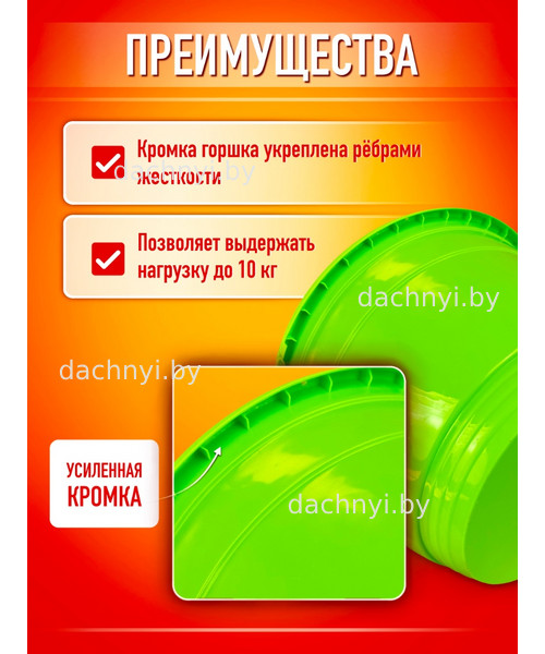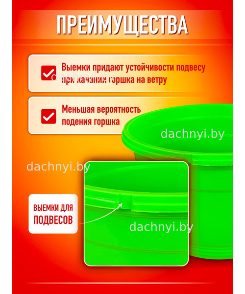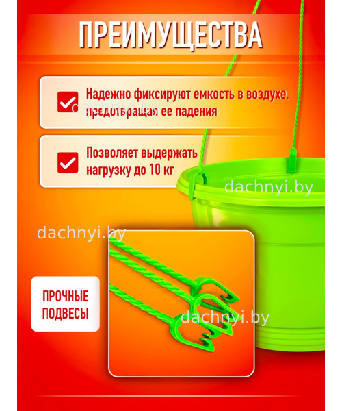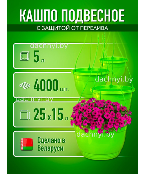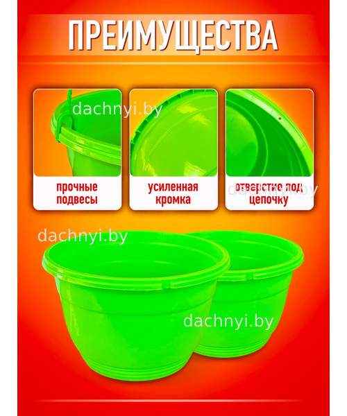 Подвесное кашпо литое для цветов предназначено для размещения декоративных растений для дома, улицы, балкона, веранды. Интерьерный горшок для орхидей и фиалок подвешивается на трех держателях, объединенных удобным крючком. Поставляется в картонной коробке, что минимизирует повреждения. Отличный подарок любимой или маме, бабушке и тете, сестре и всем любителям домашней микрозелени и озеленения в целом. Набор кашпо объемом 5 л. Горшки для цветов выполнены в различных цветах, благодаря чему вы всегда сможете подобрать необходимый оттенок для Вас. Горшок для цветов изготовлен из высококачественного, надежного и крепкого пластика, который абсолютно безопасен для использования. Данная модель горшка идет в комплекте с подвесом. На дне кашпо для растений предусмотрены дренажные отверстие, которое сохраняет небольшое количество воды в горшке для поддержания оптимальной влажности. Наш цветочный горшок подойдет для петуний, фиалок и других цветов. При необходимости, можно легко снять подвес, и использовать как напольное кашпо, декоративное кашпо или вазон. Вазоны на лоджию, балкон, цветы, вазы и кашпо для загородного дома станет отличным подарком на 8 марта новоселье для любимых или просто так порадовать себя.